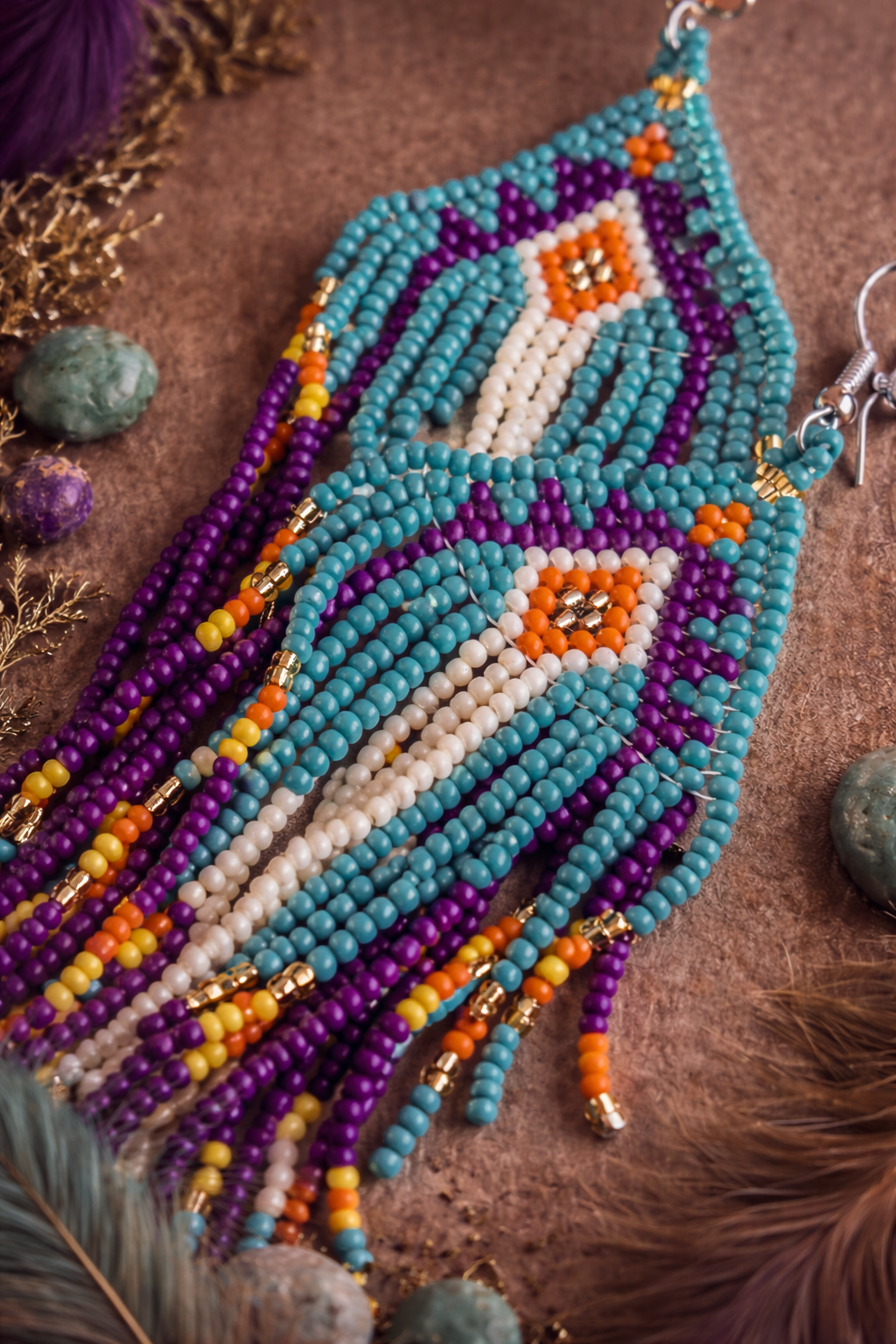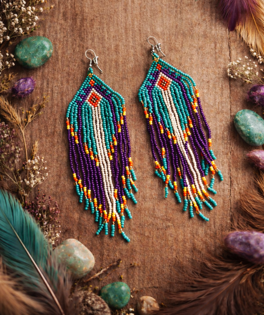 Ilgi, iš stiklo karoliukų auskarai, įkvėpti keturių stichijų – ugnies, vandens, oro ir žemės. Turkio atspalviai simbolizuoja vandenį ir dangų, violetinė – paslaptį ir orą, oranžinė bei geltona – ugnies energiją, o švelnūs žemės tonai suteikia natūralumo bei balanso.