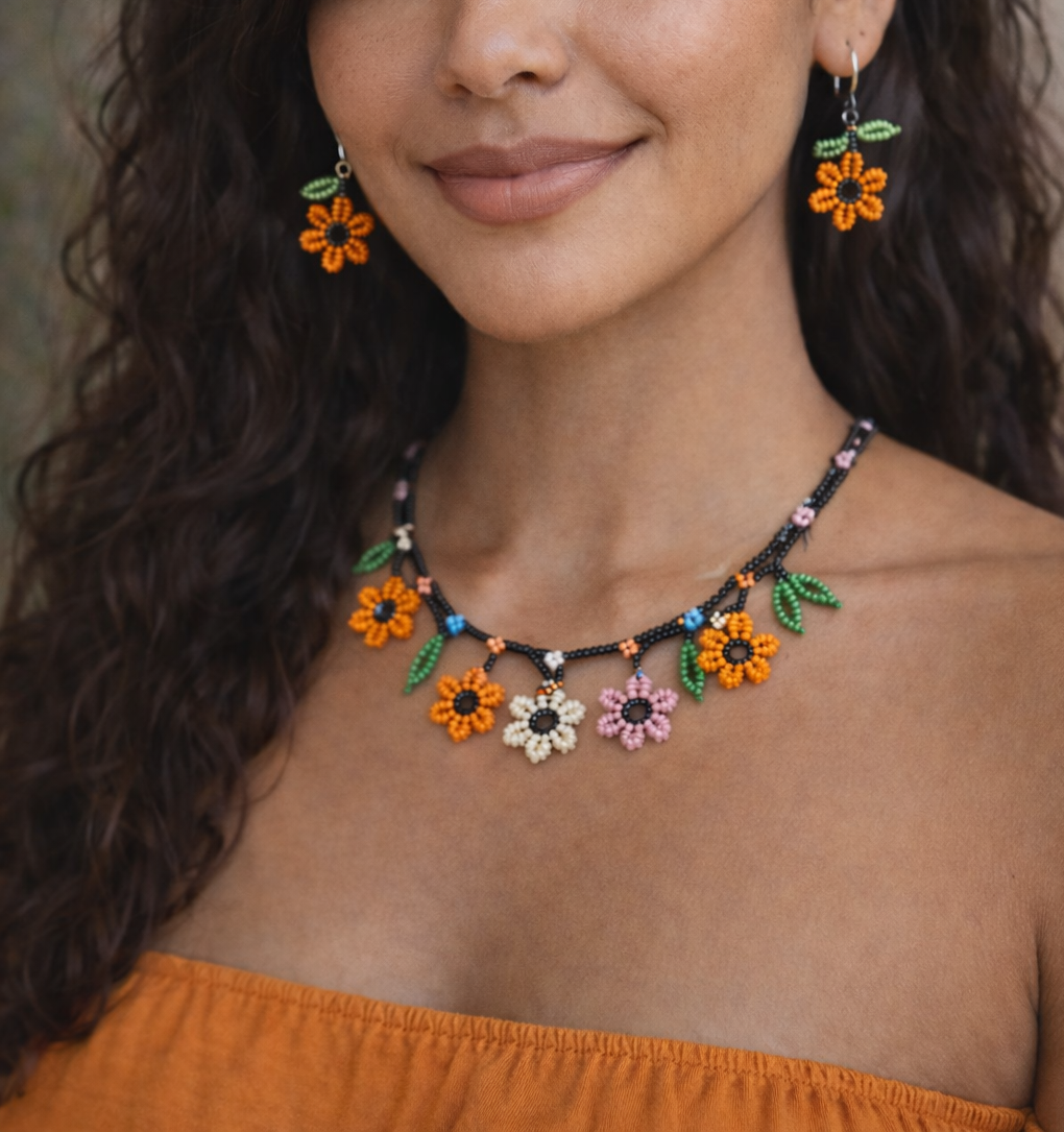 Švelnus, iš stiklo karoliukų sukurtas papuošalų rinkinys, kuriame spalvingi žiedai ir žali lapeliai susilieja į lengvą, gyvą ornamentą. Švelnios formos ir ryškūs akcentai kuria tylų, bet pastebimą grožį – tarsi žiedai, kurie pražysta tik tiems, kurie moka juos pamatyti.