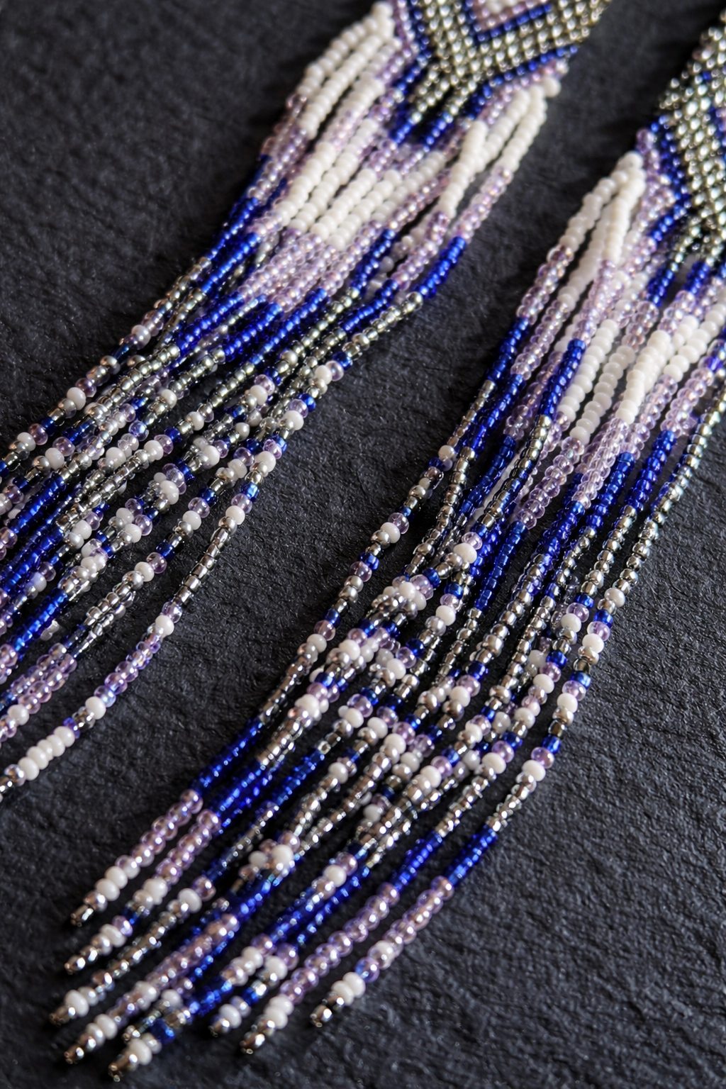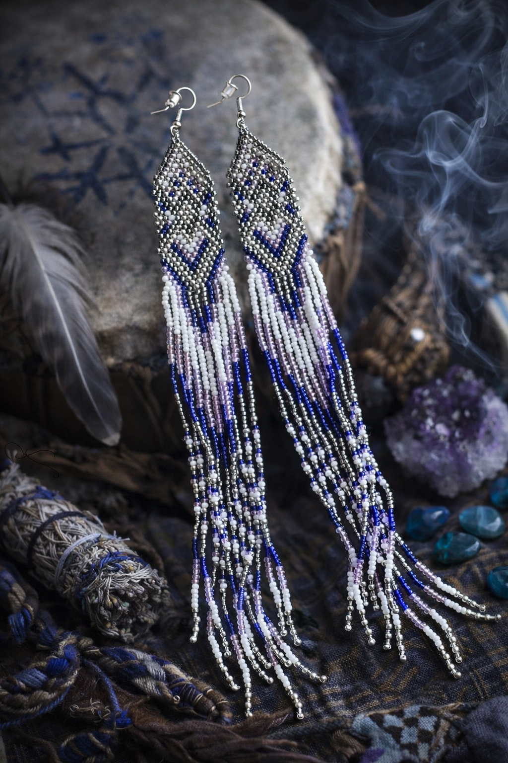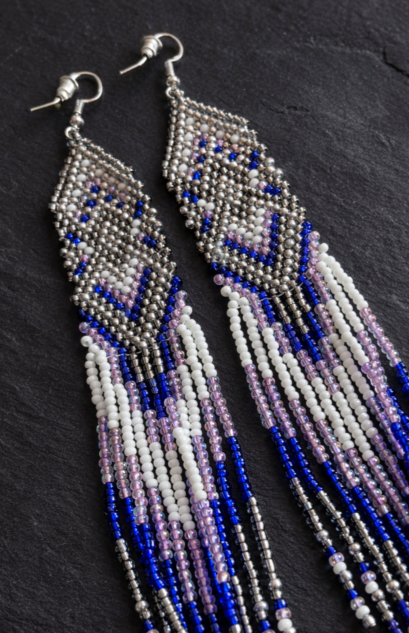 Ilgi, iš stiklo karoliukų auskarai, įkvėpti tylos ir paslaptingos nakties energijos. Gili mėlyna, sidabro ir balta spalvos primena žvaigždėtą dangų, mėnulio šviesą ir ramų nakties alsavimą.