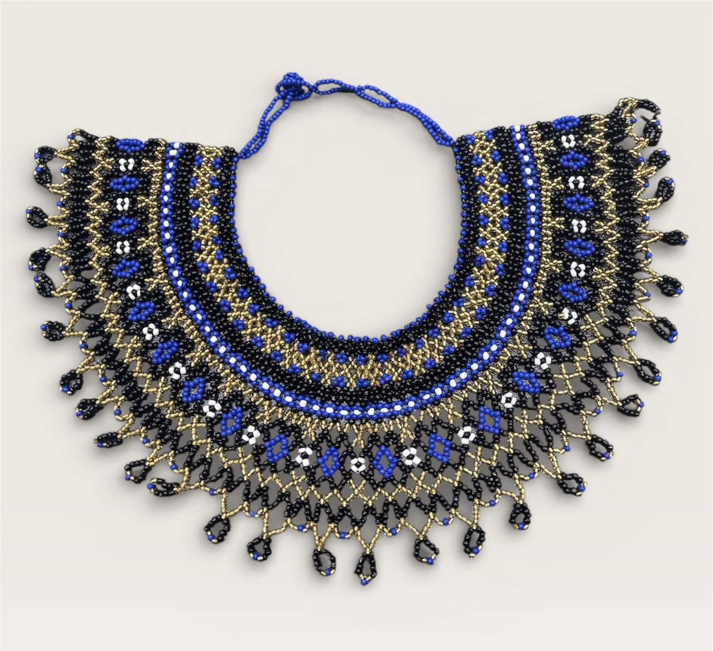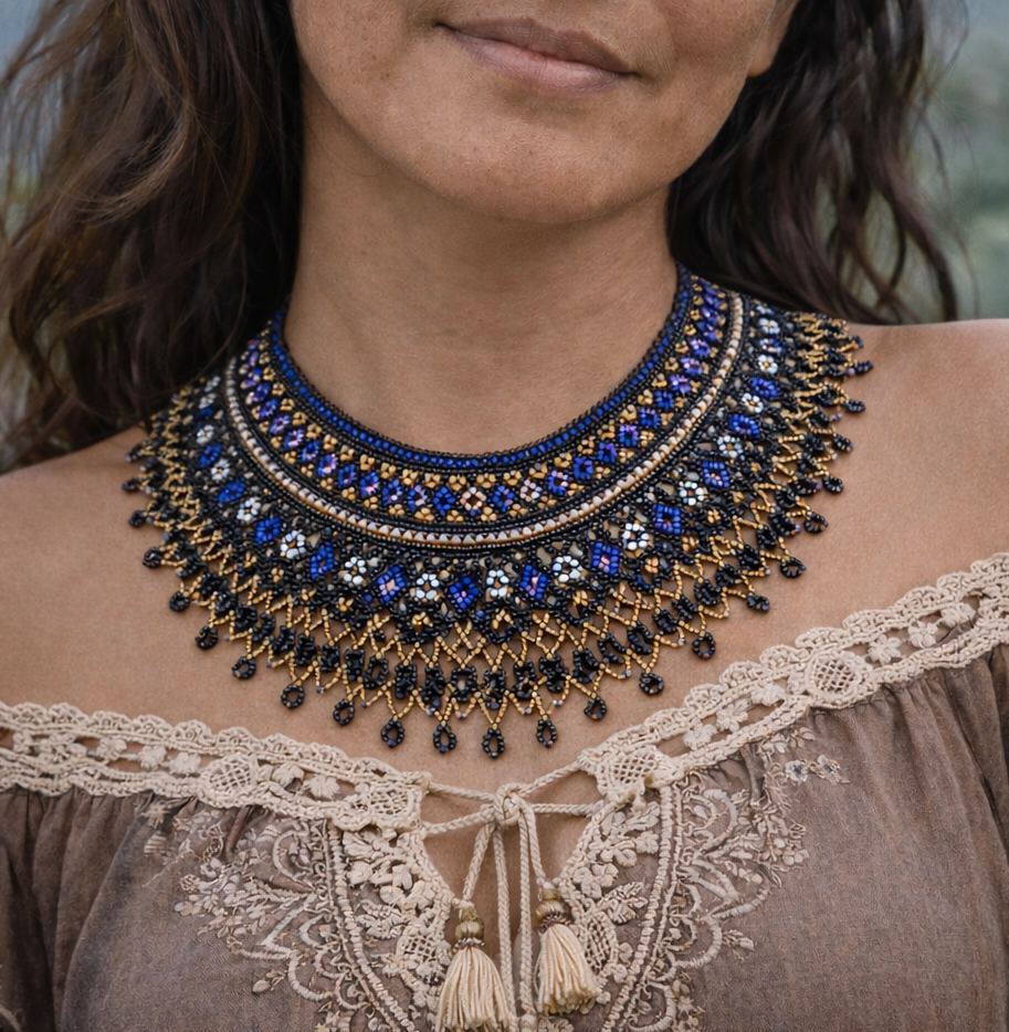 Įspūdingas kaklo papuošalas, įkvėptas naktinio dangaus ir paslaptingų žvaigždynų. Gili juoda primena kosmoso begalybę, ryški mėlyna – tolimas žvaigždes, o aukso akcentai spindi tarsi dangaus šviesuliai.